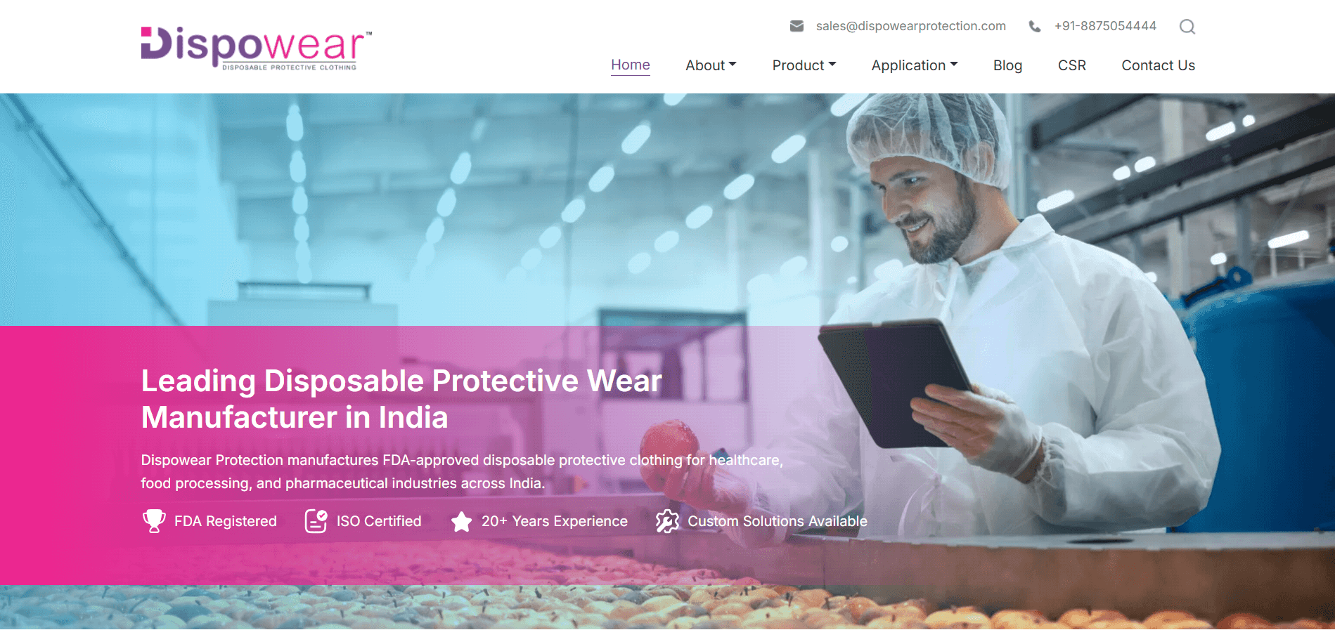 Dispowear Protection is an established Indian manufacturer of disposable protective clothing and non-woven spun-bond fabric — FDA registered, ISO certified, and with over 20 years of manufacturing experience. Their product range serves critical industries including healthcare, pharmaceuticals, food processing, research laboratories, cleanrooms, beauty and salon, and chemical environments.